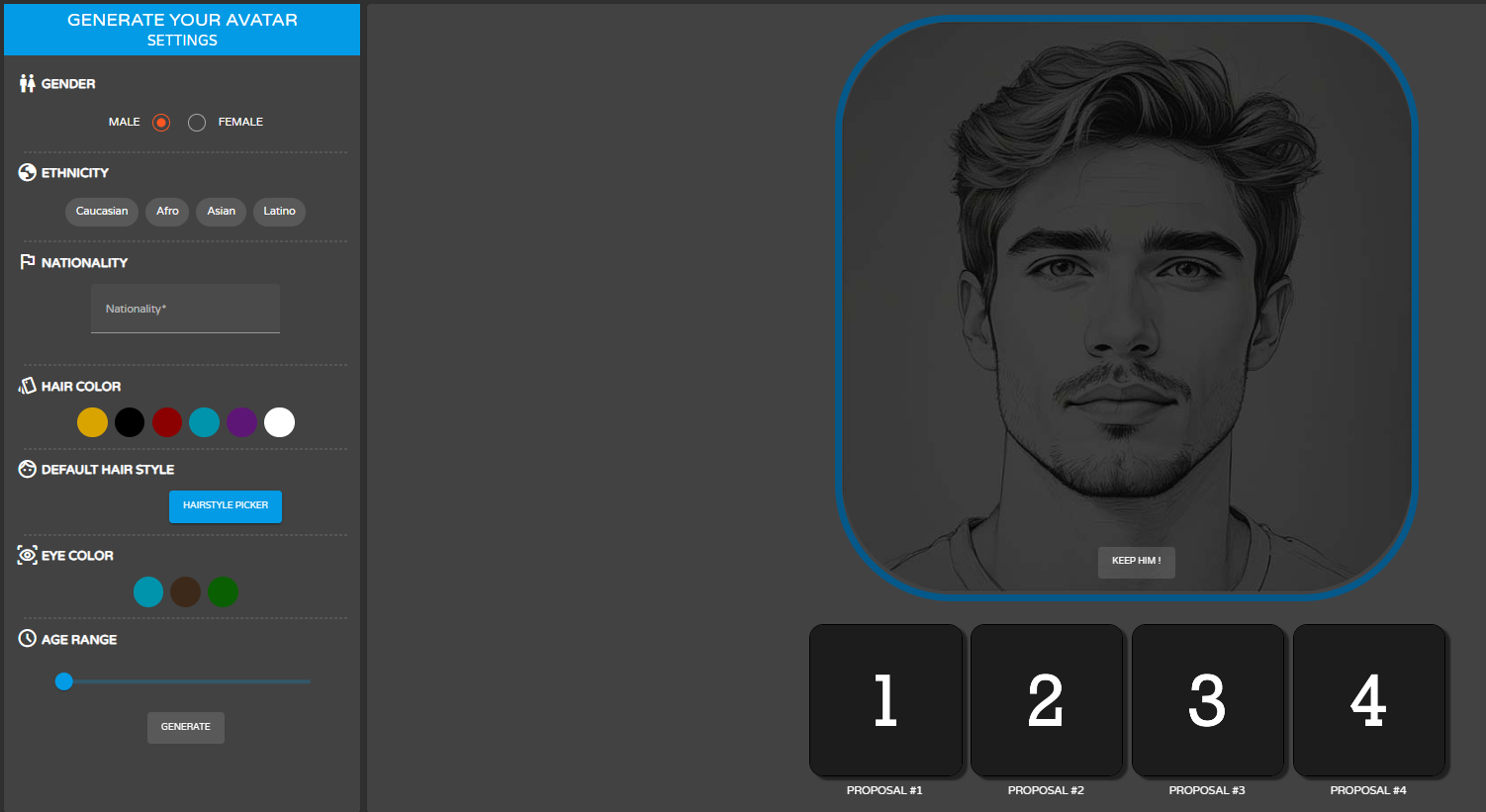 Select the characteristics of the Avatar you want to create and generate 4 proposals for your avatar.&#x20;