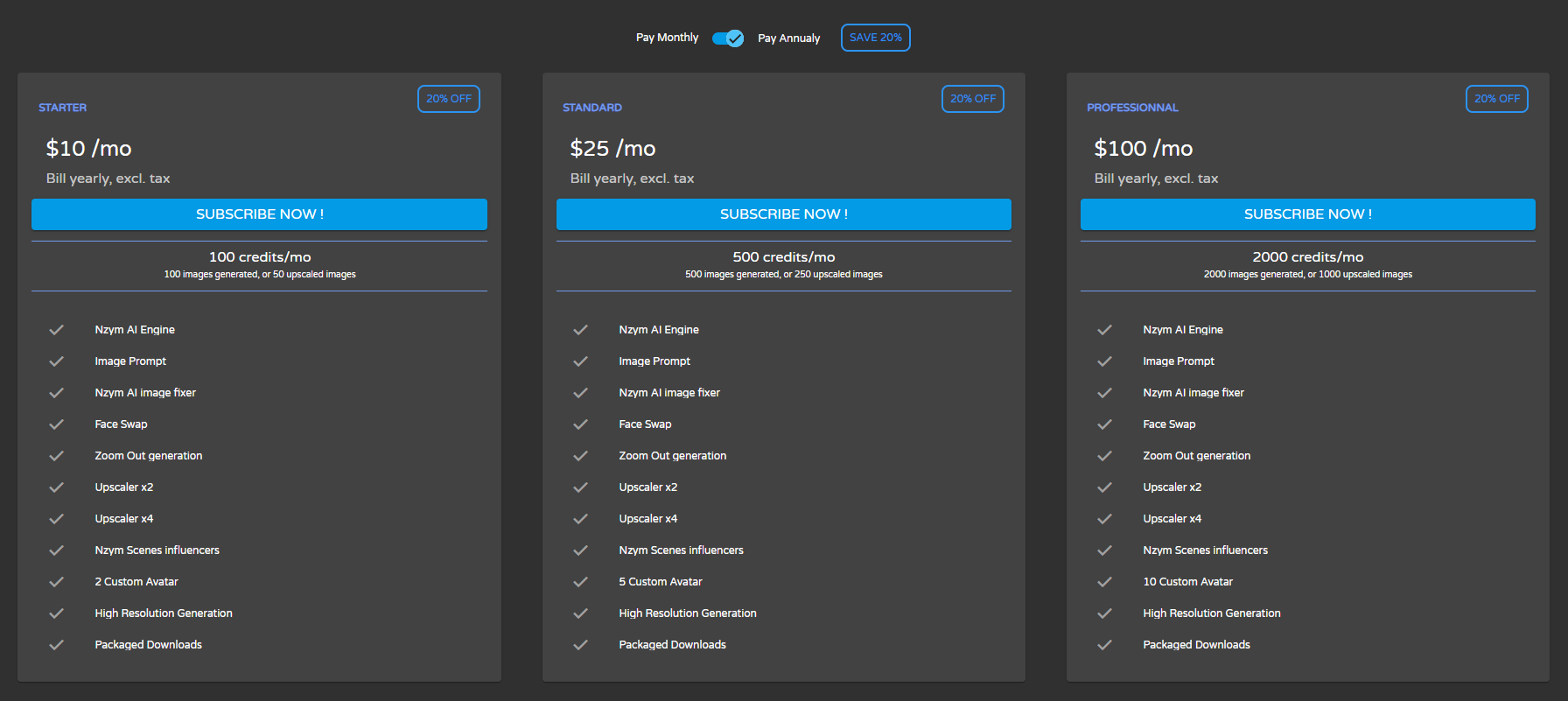 You have 100 free credits to discover Nzym Studio and the Avatar Lab. This represents 100 images you can create or 50 upscaled images.