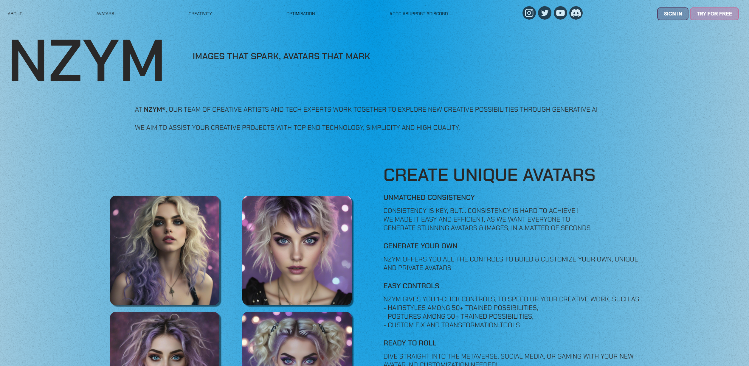 > **Use NZym to generate stunning images from text or images prompts. Use avatars to create your own AI Character. Learn from the community and connect with AI artists around the world.**
